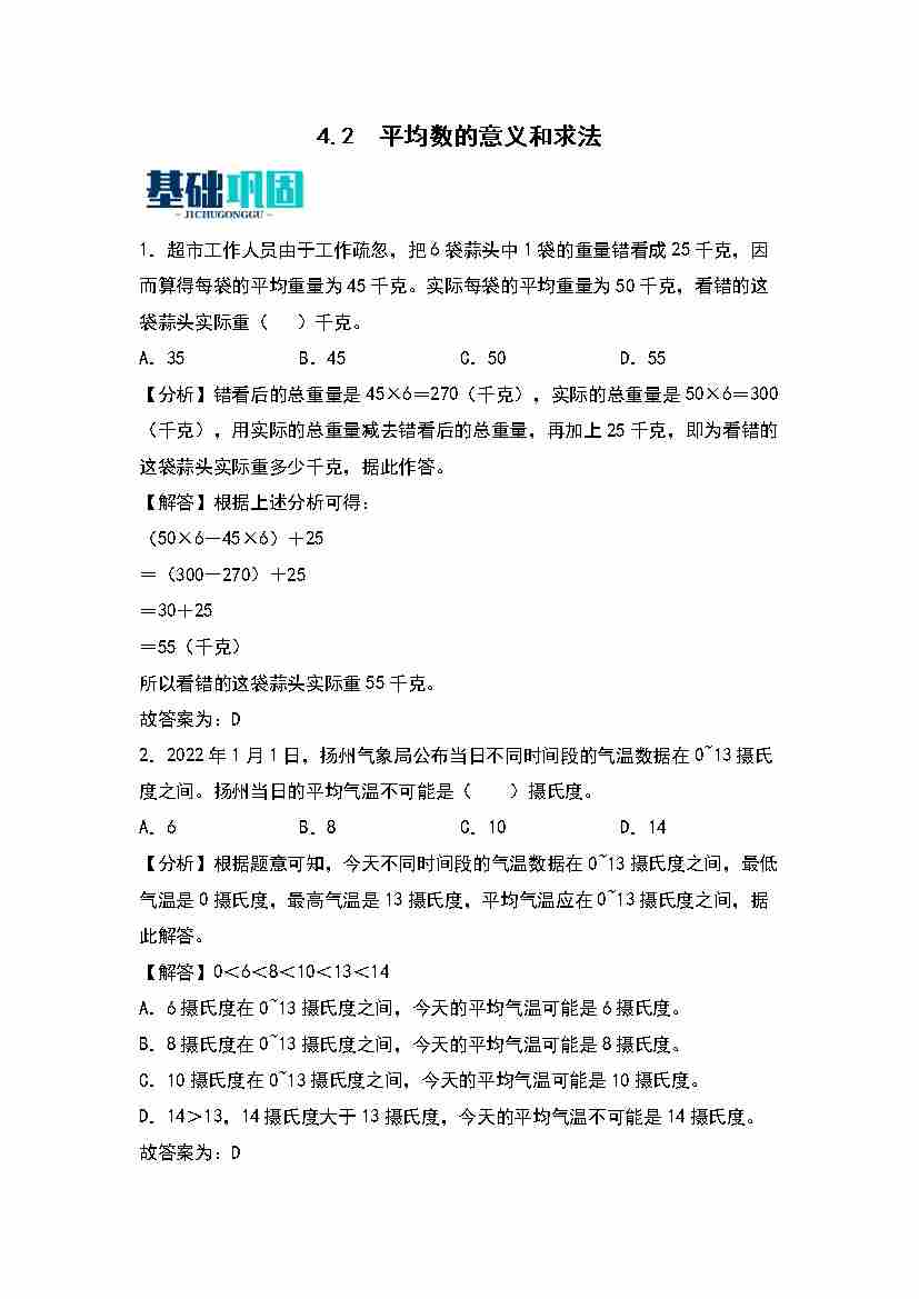 首页 > 全部 > 分层作业 > 4.2  平均数的意义和求法 同步分层作业(教师版)(苏教版)