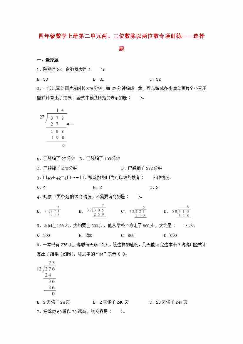 首页 > 全部 > 题型突破 > 第2单元两、三位数除以两位数题型突破——选择题(苏教版,含答案)
