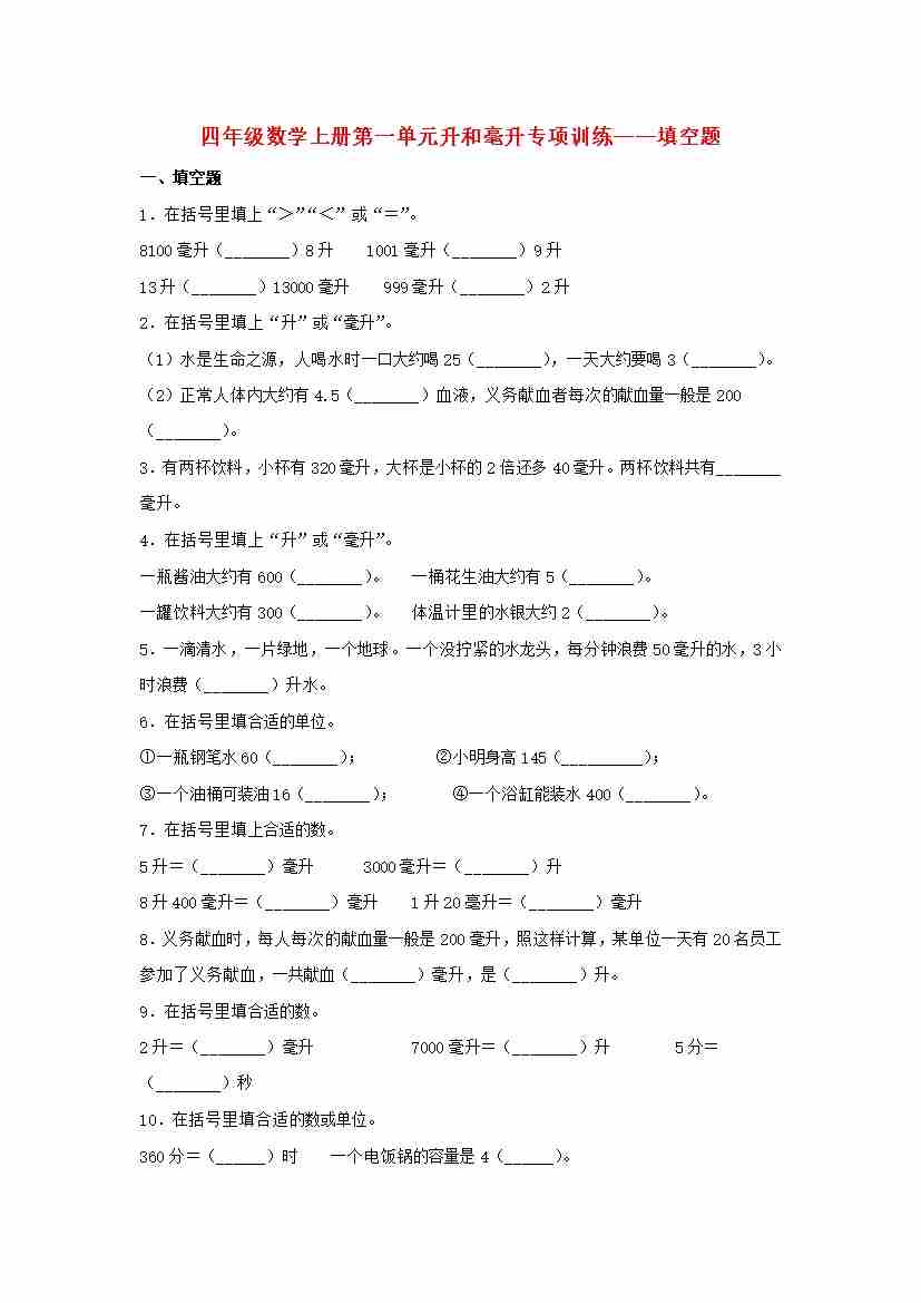 首页 > 全部 > 题型突破 > 第1单元升和毫升题型突破——填空题(苏教版,含答案)