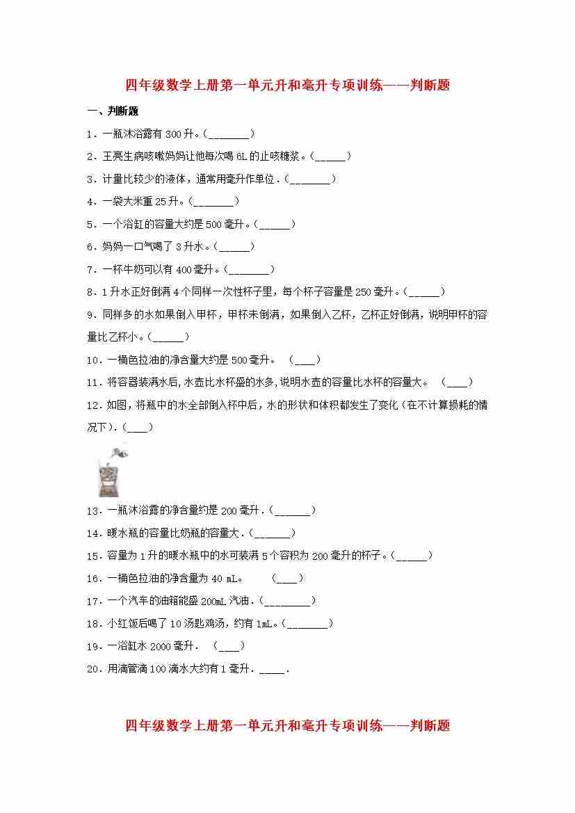 第1单元升和毫升题型突破——判断题(苏教版,含答案)