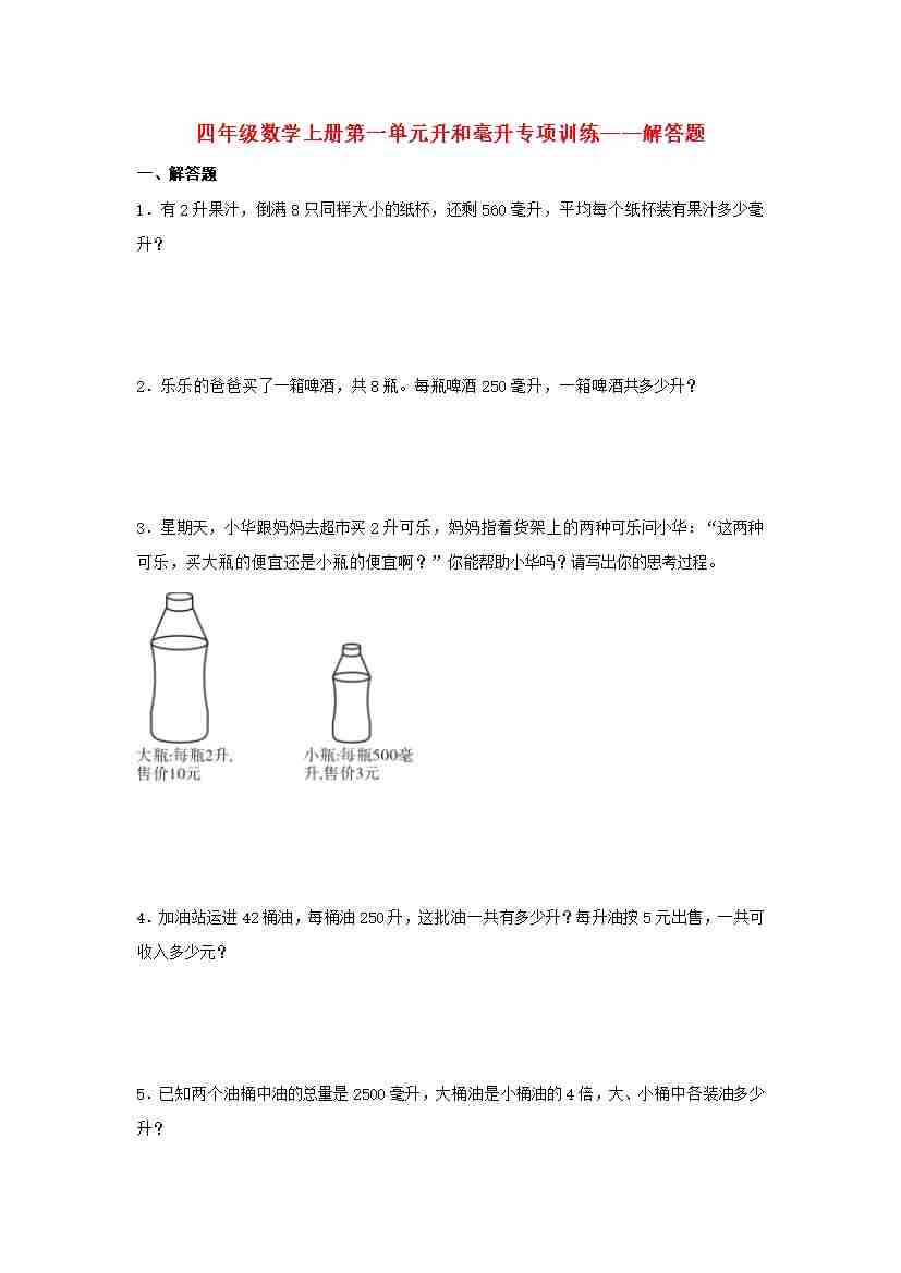 首页 > 全部 > 题型突破 > 第1单元升和毫升题型突破——解答题(苏教版,含答案)