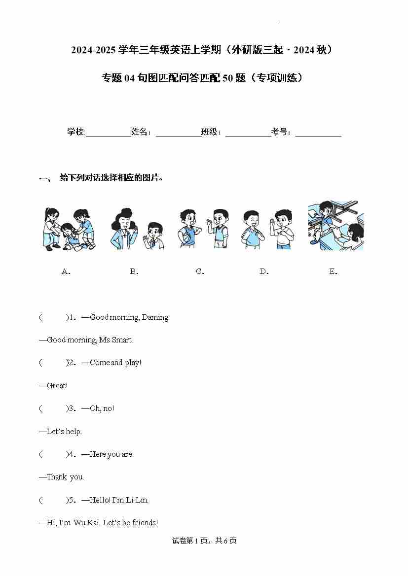 首页 > 全部 > 专项训练 > 专题04句图匹配&问答匹配50题(专项训练)-2024-2025学年三年级英语上学期(外研版三起·2024秋)