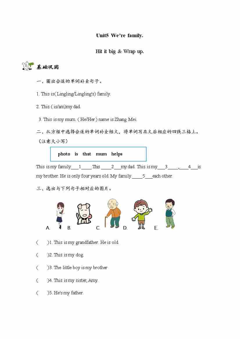 Unit 5 We're family. Hit it big & Wrap up.(第3课时)同步分层作业-2024-2025学年英语三年级上册(外研版三起·2024秋)