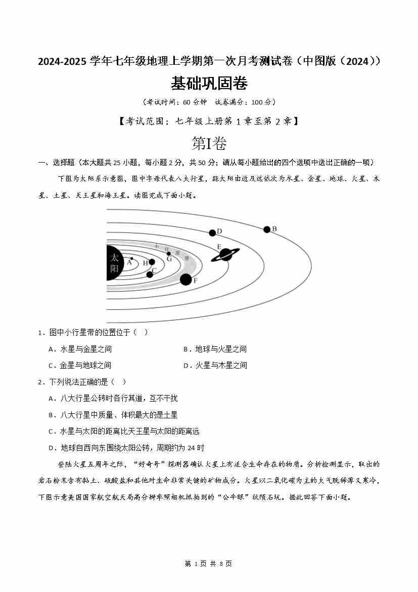 首页 > 全部 > 第一次月考 > 基础巩固卷-【分层卷·月考卷】2024-2025学年七年级地理上学期第一次月考测试卷(中图版(2024))(原卷版)