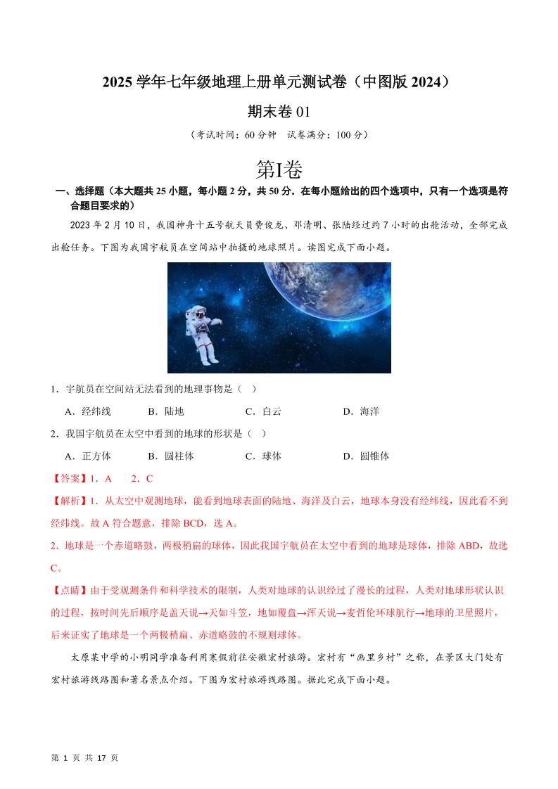 期末卷01-2025学年七年级地理上册单元速记·巧练(中图版)(原卷版)