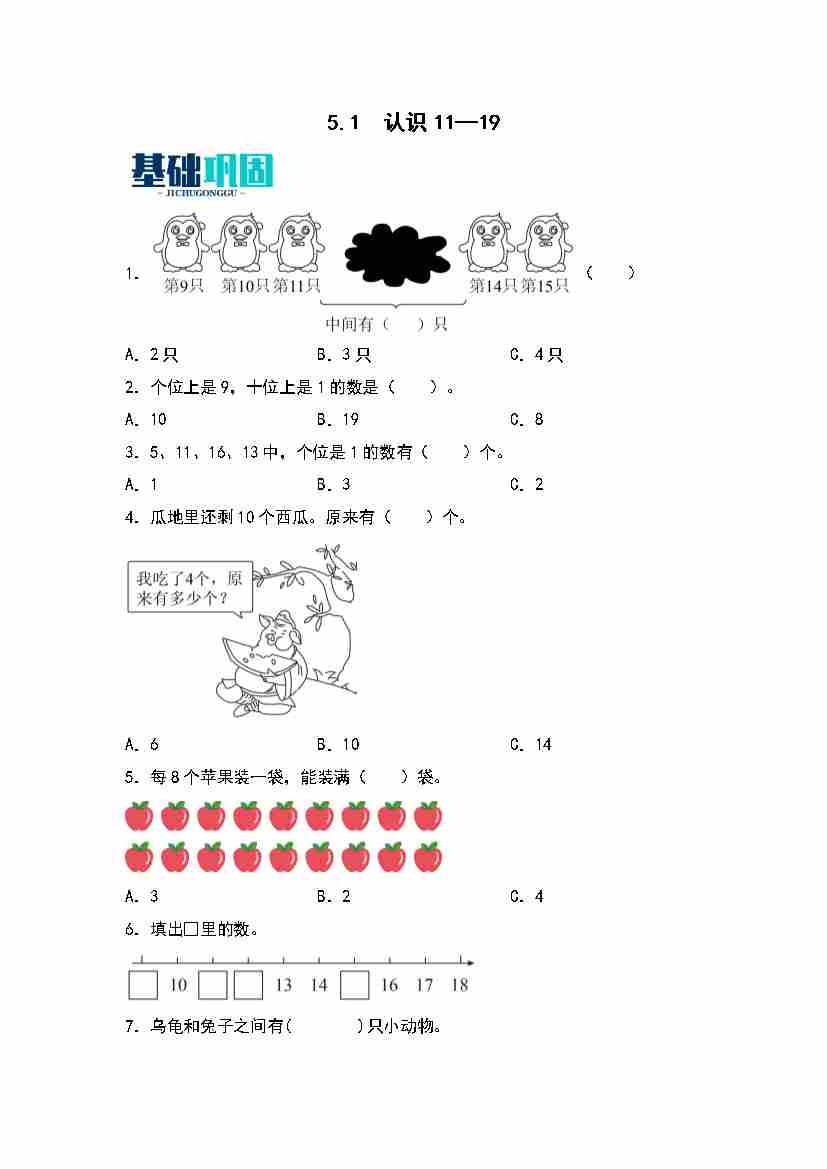 5.1  认识11—19 同步分层作业(学生版)(苏教版·2024秋)