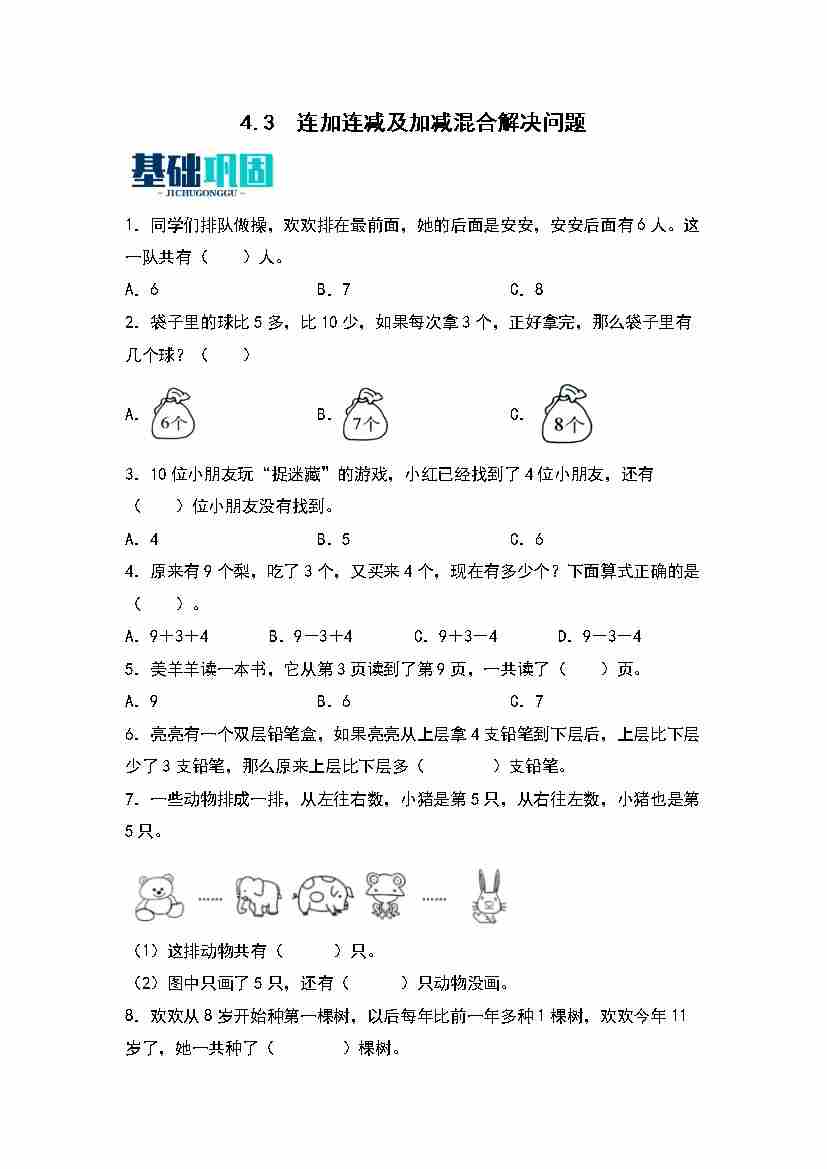 4.3  连加连减及加减混合解决问题 同步分层作业(学生版)(苏教版·2024秋)