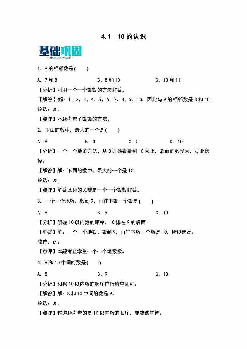 4.1  10的认识 同步分层作业(教师版)(苏教版·2024秋)
