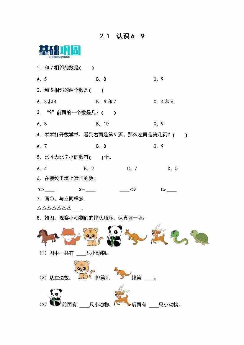 2.1  认识6—9 同步分层作业(学生版)(苏教版·2024秋)