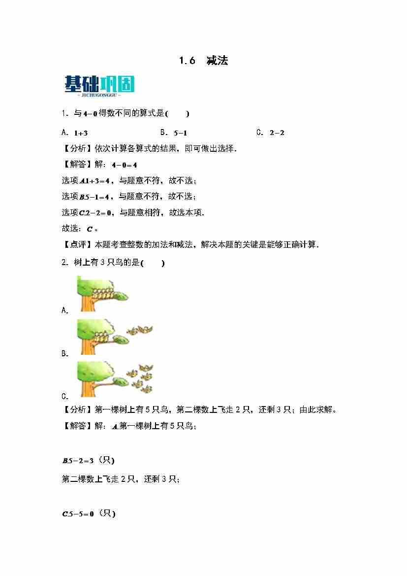 首页 > 全部 > 同步练习 > 1.6  减法 同步分层作业(教师版)(苏教版)