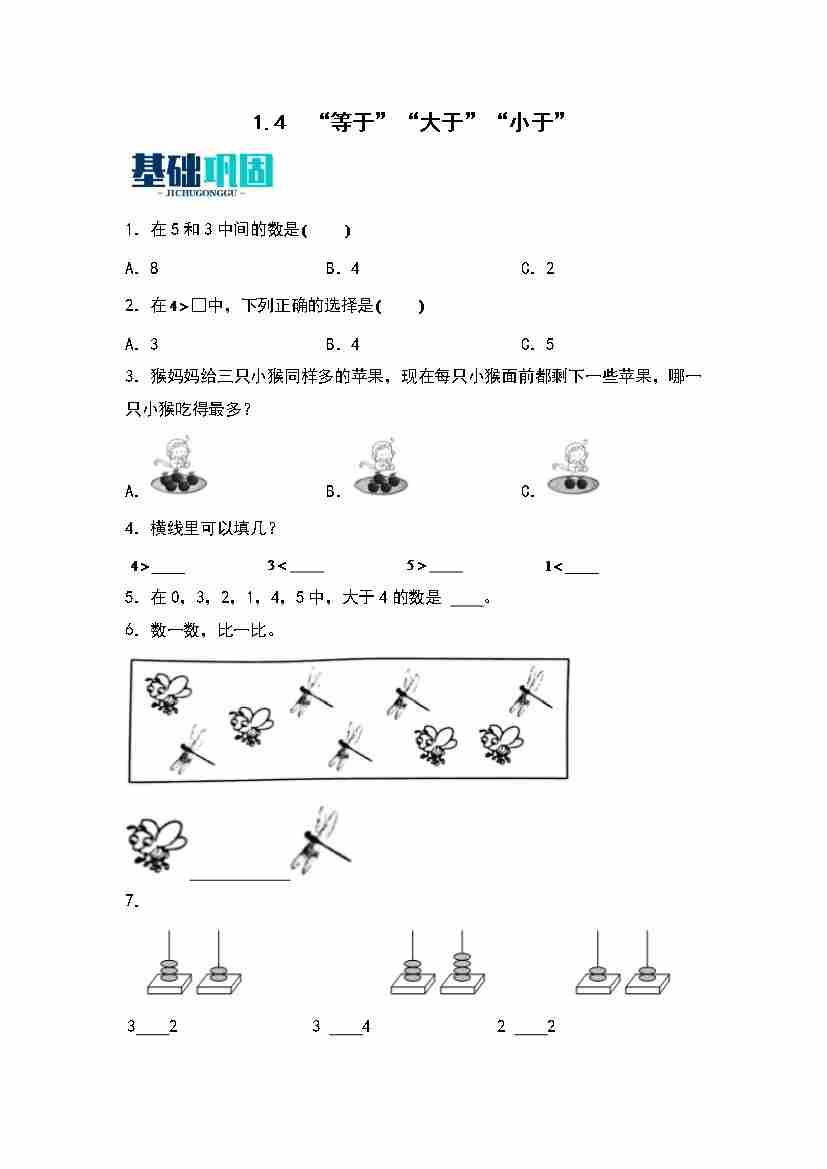 首页 > 全部 > 同步练习 > 1.4  “等于”“大于”“小于” 同步分层作业(学生版)(苏教版)