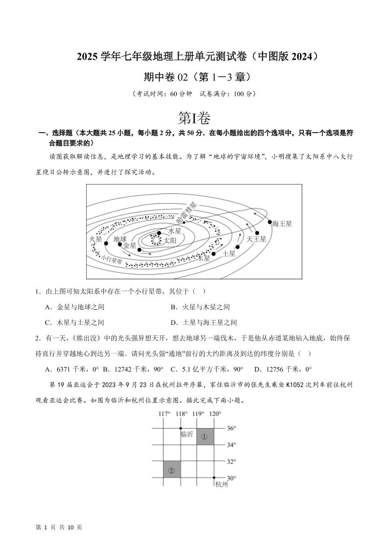 首页 > 全部 > 期中试卷 > 期中卷02-2025学年七年级地理上册单元速记·巧练(中图版2024)(原卷版)