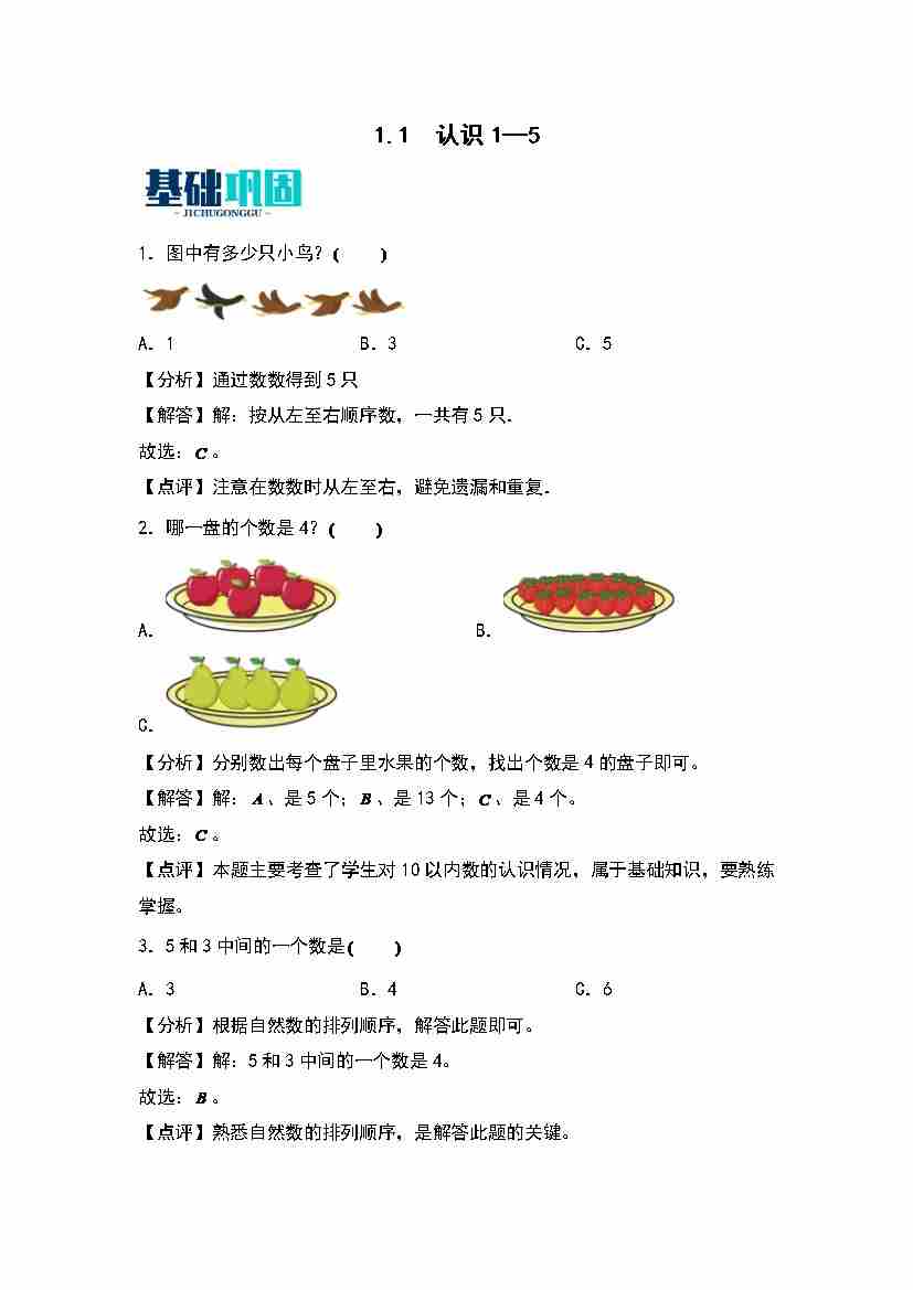 首页 > 全部 > 同步练习 > 1.1  认识1—5 同步分层作业(教师版)(苏教版·2024秋)