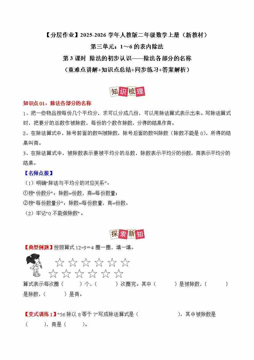 首页 > 全部 > 分层作业 > 第三单元第3课时 除法的初步认识——除法各部分的名称(分层作业)数学人教版二年级上册(新教材)(学生版)
