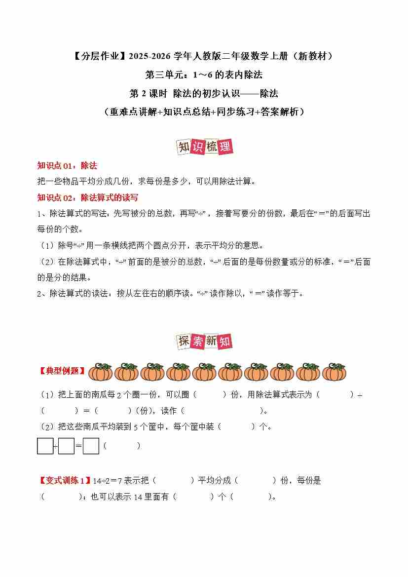 第三单元第2课时 除法的初步认识——除法 (分层作业)数学人教版二年级上册(新教材)(学生版)