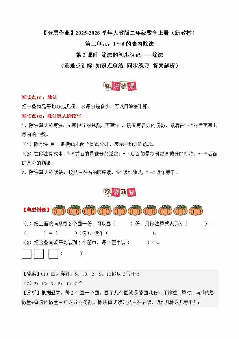 首页 > 全部 > 分层作业 > 第三单元第2课时 除法的初步认识——除法 (分层作业)数学人教版二年级上册(新教材)(解析版)
