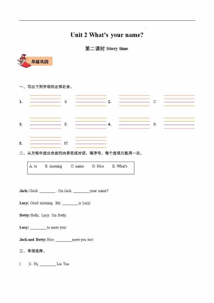 首页 > 全部 > 同步练习 > Unit 2 What's your name Story time-2024-2025学年三年级英语上册同步分层作业设计系列(译林版三起)