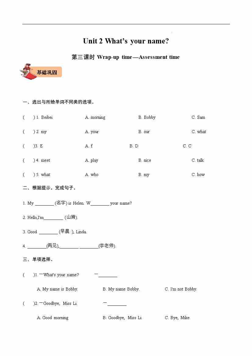 Unit 2 What's your name Wrap-up time-Assessment time-2024-2025学年三年级英语上册同步分层作业设计系列(译林版三起)