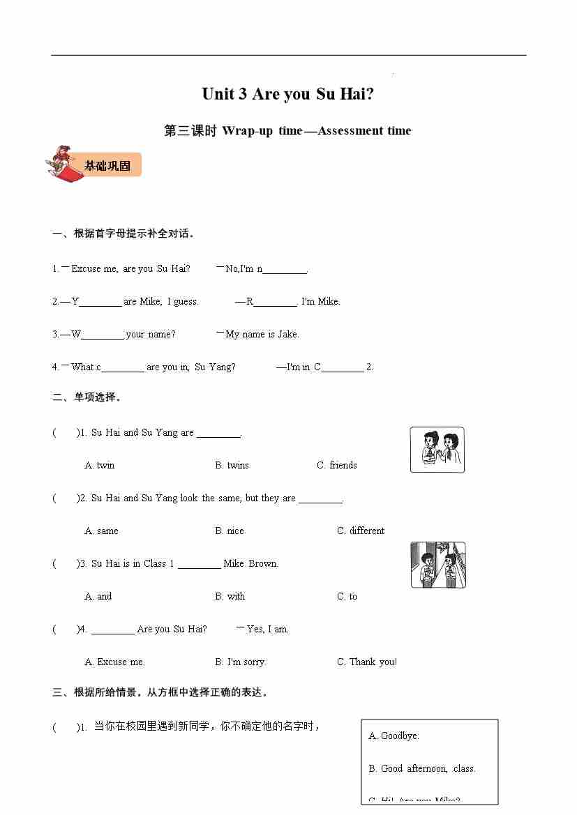 Unit 3 Are you Su Hai Wrap-up time—Assessment time-2024-2025学年三年级英语上册同步分层作业设计系列(译林版三起)