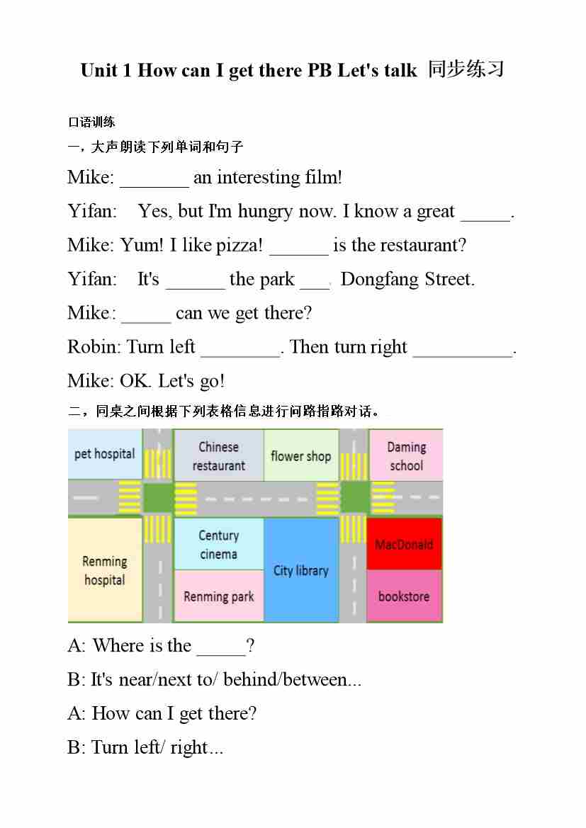 六年级上册英语同步练习-Unit 1 How can I get there PB Let's talk(人教PEP,含答案)