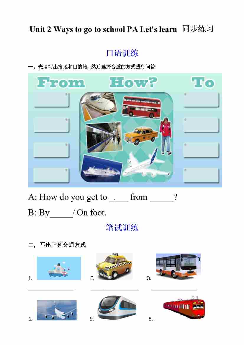 六年级上册英语同步练习-Unit 2 Ways to go to school PA Let's learn (人教PEP,含答案)
