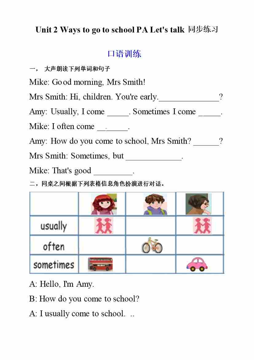 六年级上册英语同步练习-Unit 2 Ways to go to school PA Let's talk (人教PEP,含答案)
