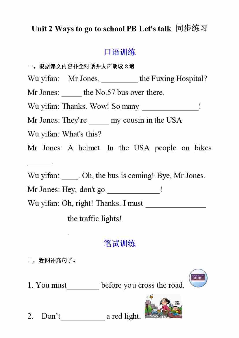六年级上册英语同步练习-Unit 2 Ways to go to school PB Let's talk (人教PEP,含答案)