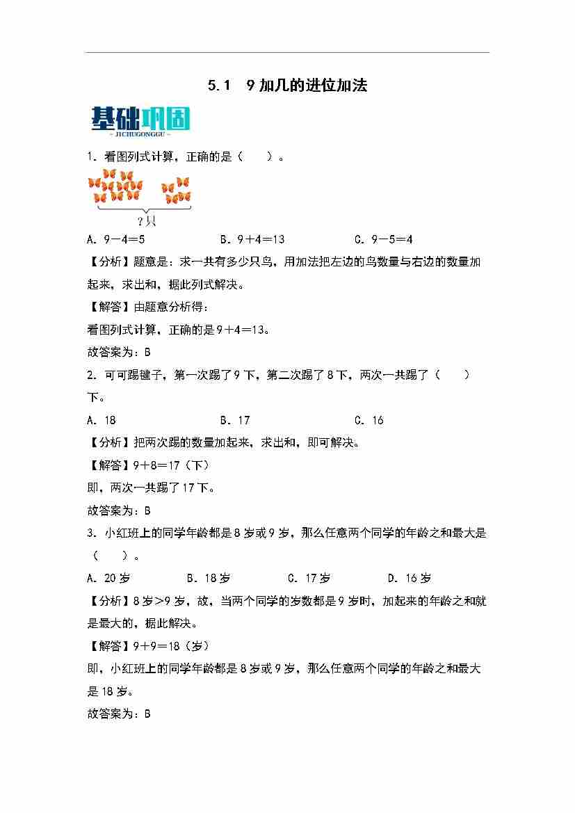 首页 > 全部 > 分层作业 > 5.1  9加几的进位加法 同步分层作业-数学一年级上册(教师版)(青岛六三版·)