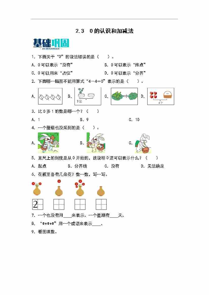 2.3  0的认识和加减法 同步分层作业-数学一年级上册(学生版)(青岛六三版·)