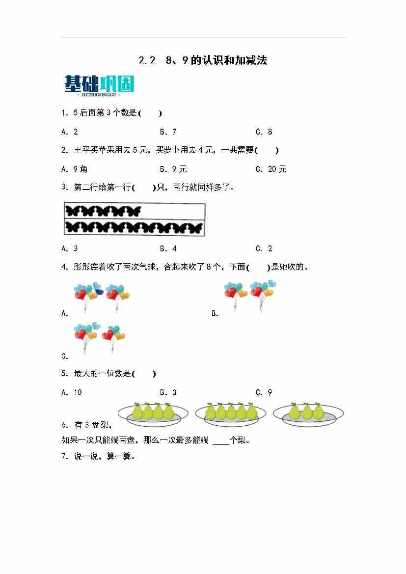 2.2  8、9的认识和加减法 同步分层作业-数学一年级上册(学生版)(青岛六三版·)