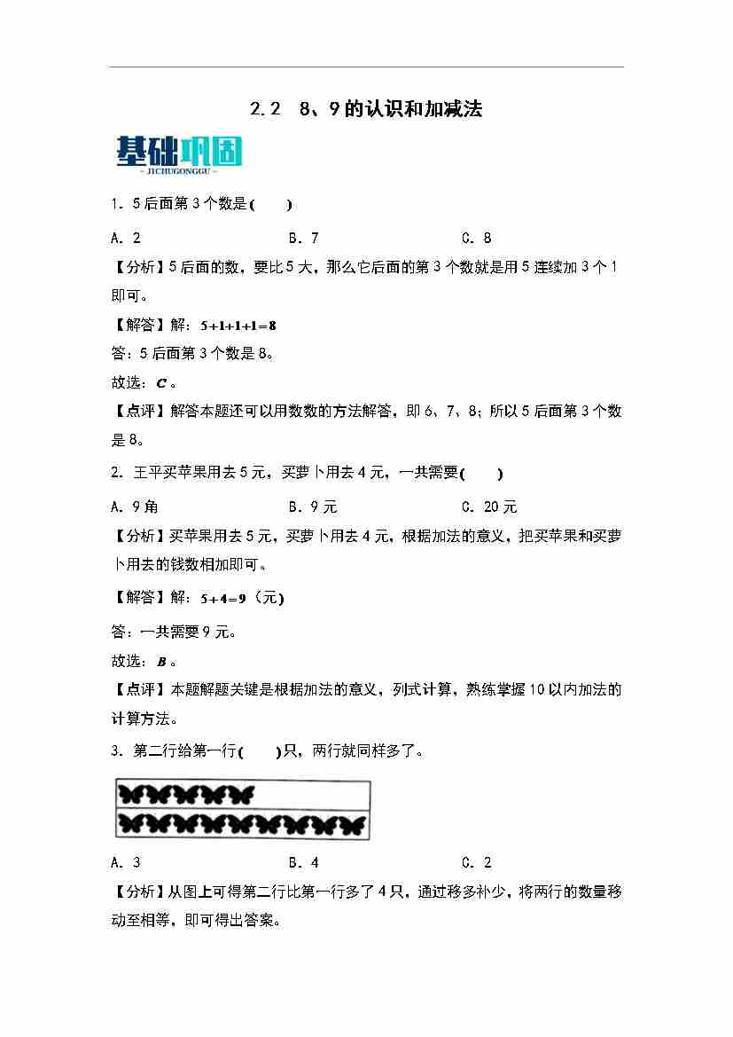 首页 > 全部 > 分层作业 > 2.2  8、9的认识和加减法 同步分层作业-数学一年级上册(教师版)(青岛六三版·)