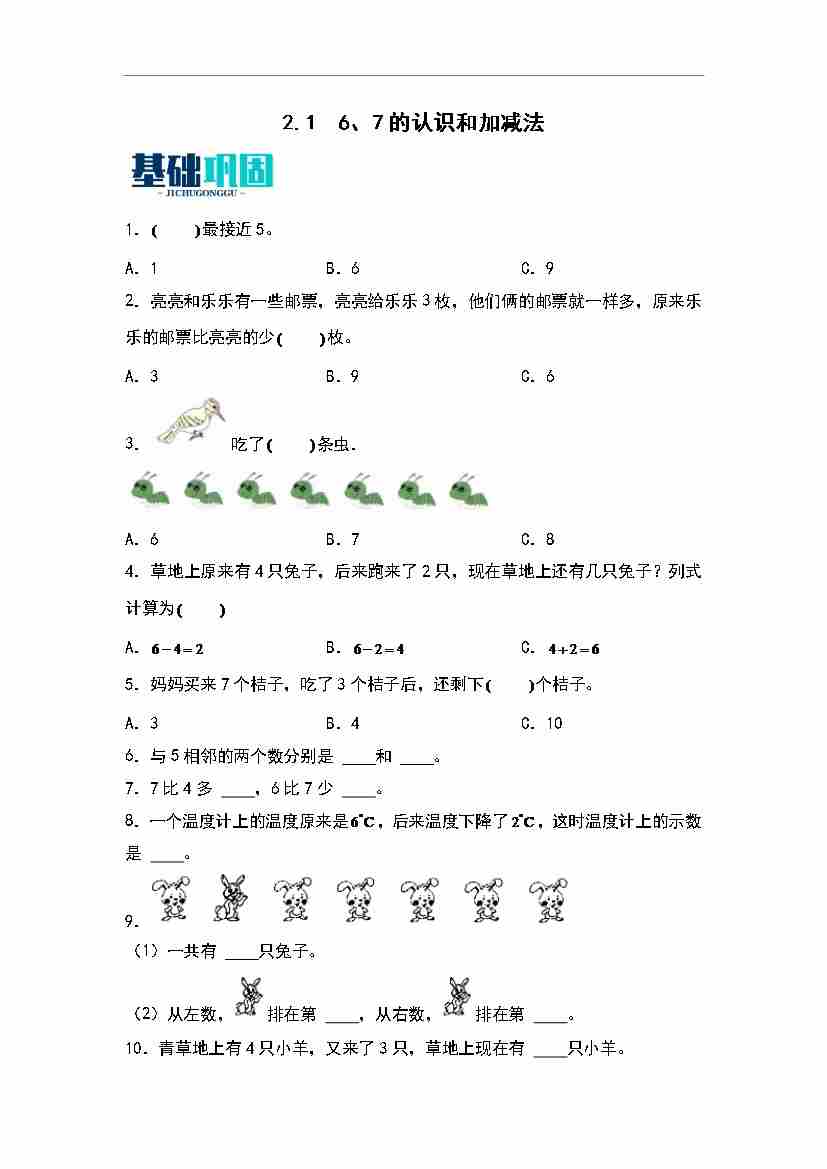 首页 > 全部 > 分层作业 > 2.1  6、7的认识和加减法 同步分层作业-数学一年级上册(学生版)(青岛六三版·)