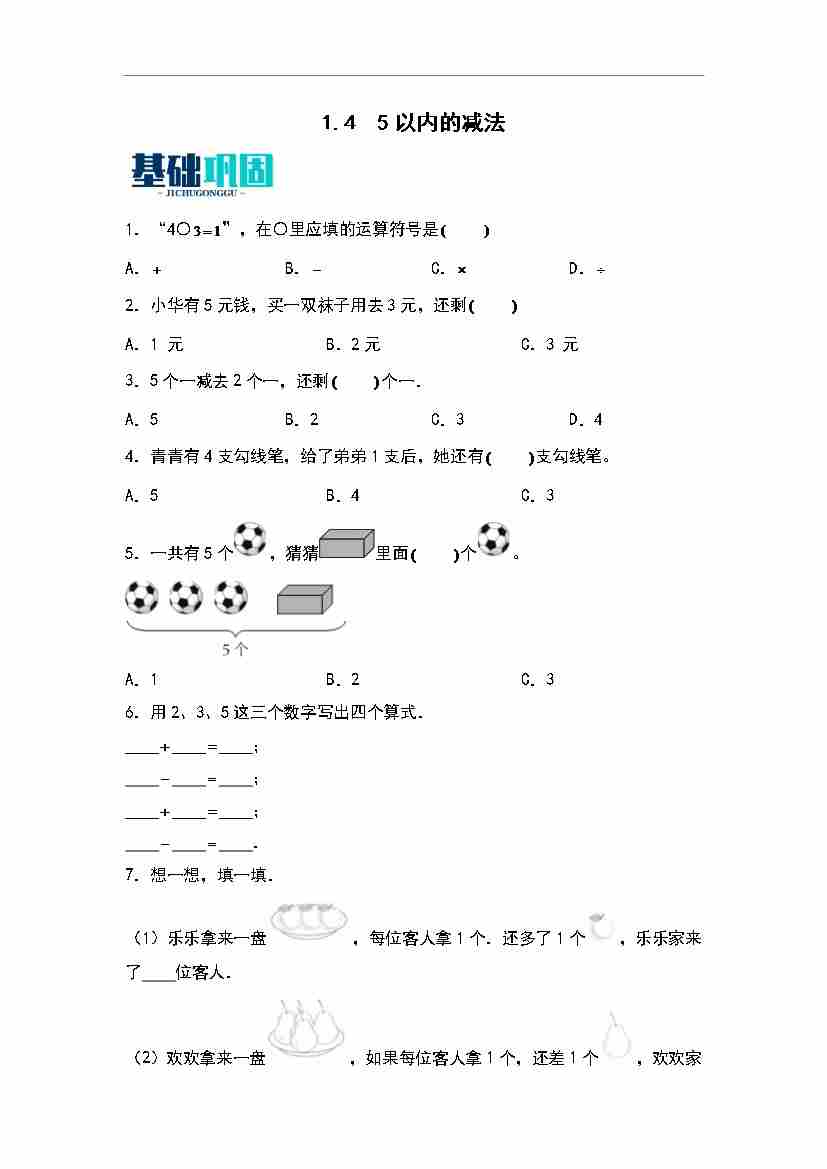 1.4  5以内的减法 同步分层作业-数学一年级上册(学生版)(青岛六三版)
