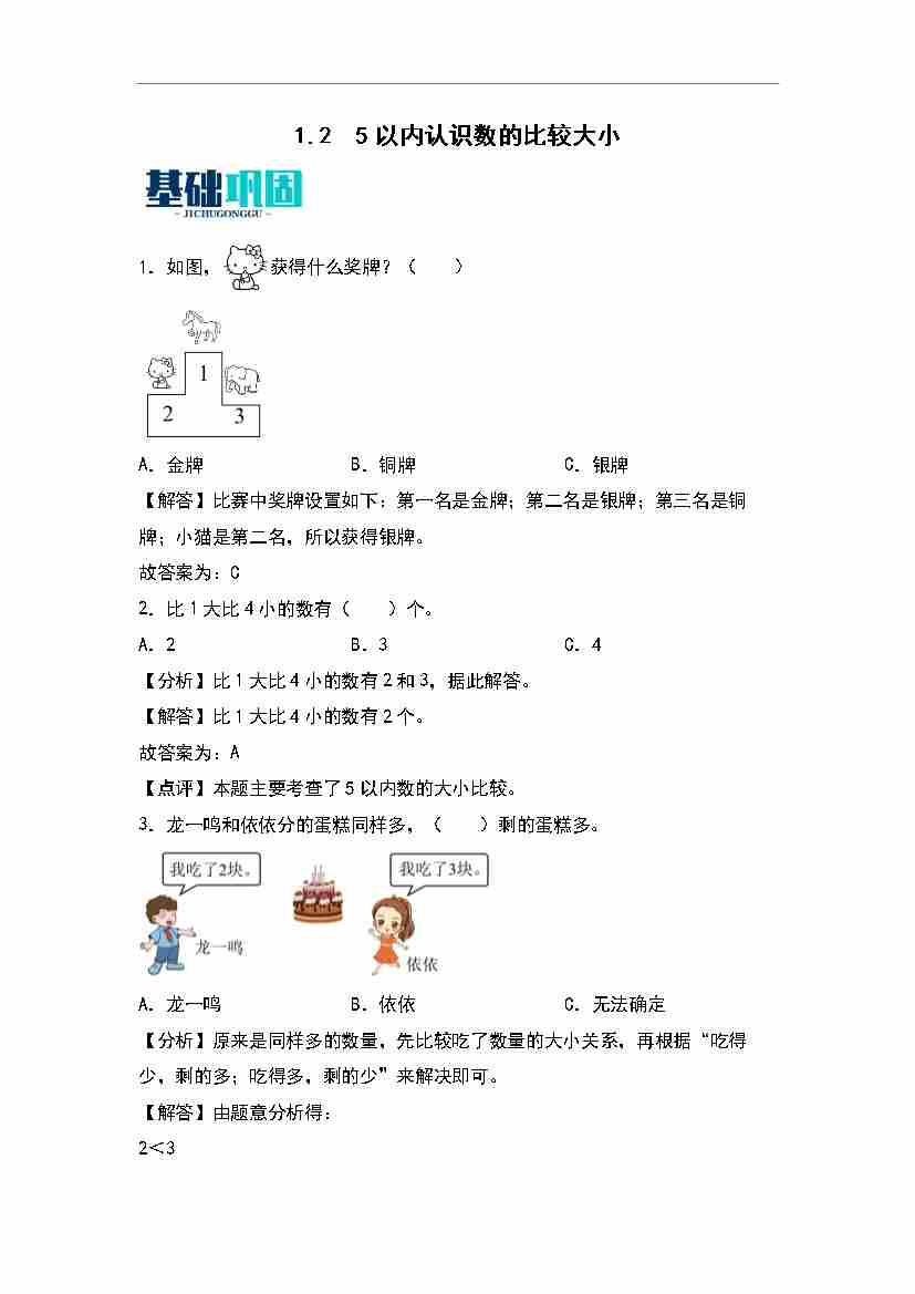 1.2  5以内认识数的比较大小 同步分层作业-数学一年级上册(教师版)(青岛六三版)