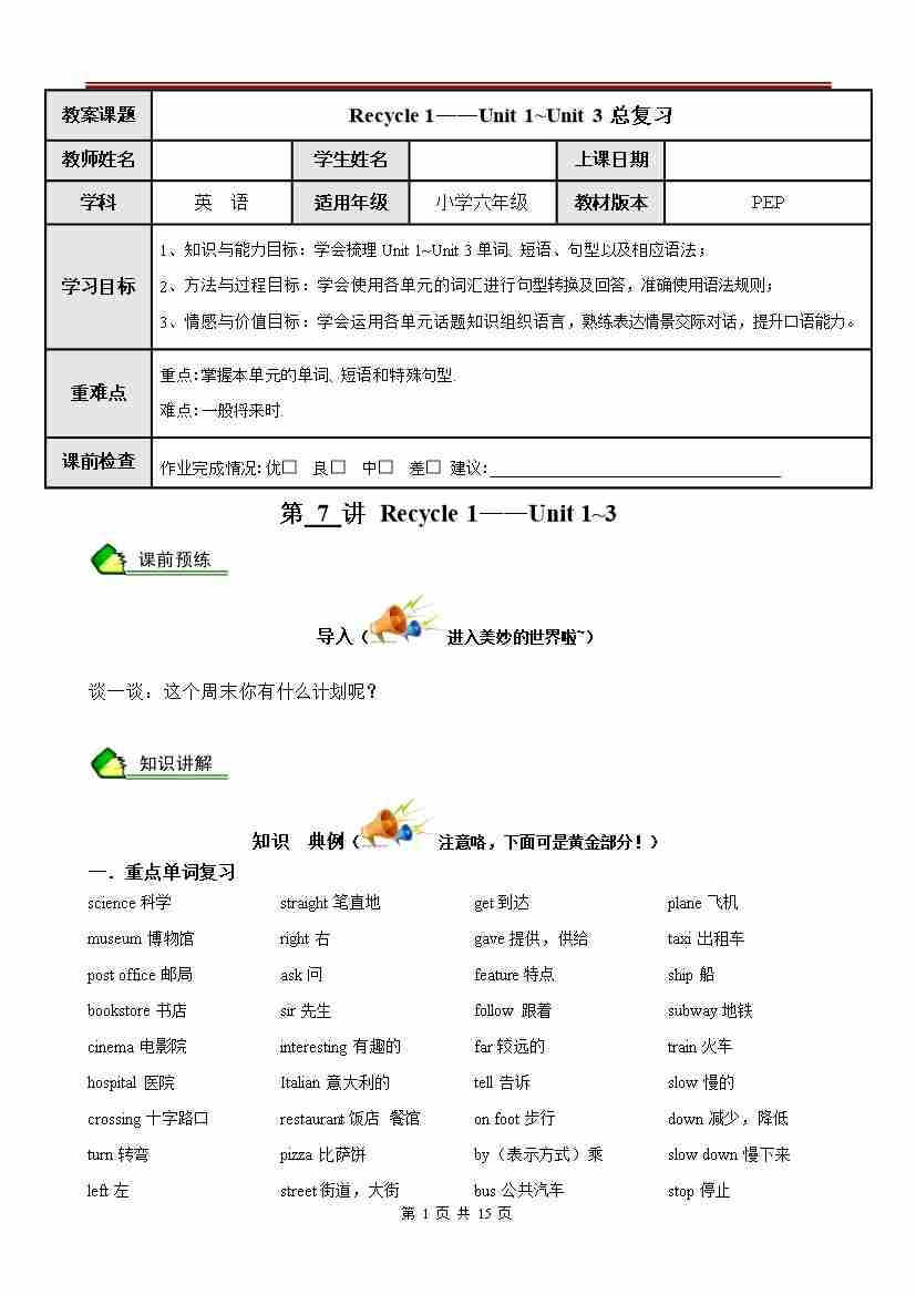 首页 > 全部 > 讲义 > 7 PEP秋季课程六年级第七讲教案 Recycle 1——Unit 1~Unit 3总复习(教师版)