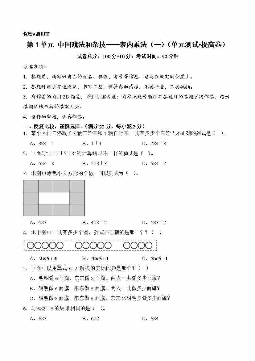 第1单元 中国戏法和杂技——表内乘法(一)(单元测试•提高卷)数学青岛版(五四制)二年级上册(A4版)