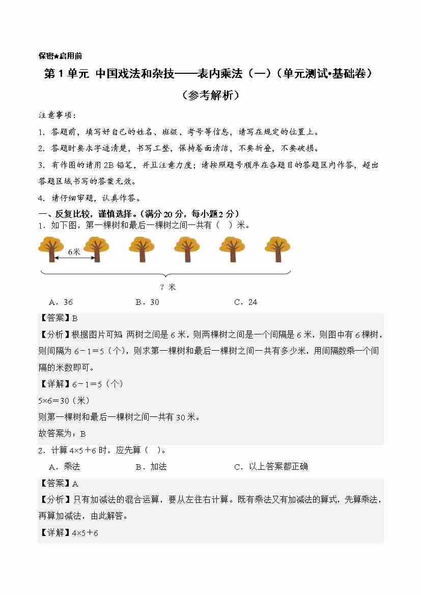 第1单元 中国戏法和杂技——表内乘法(一)(单元测试•基础卷)数学青岛版(五四制)二年级上册(参考解析)