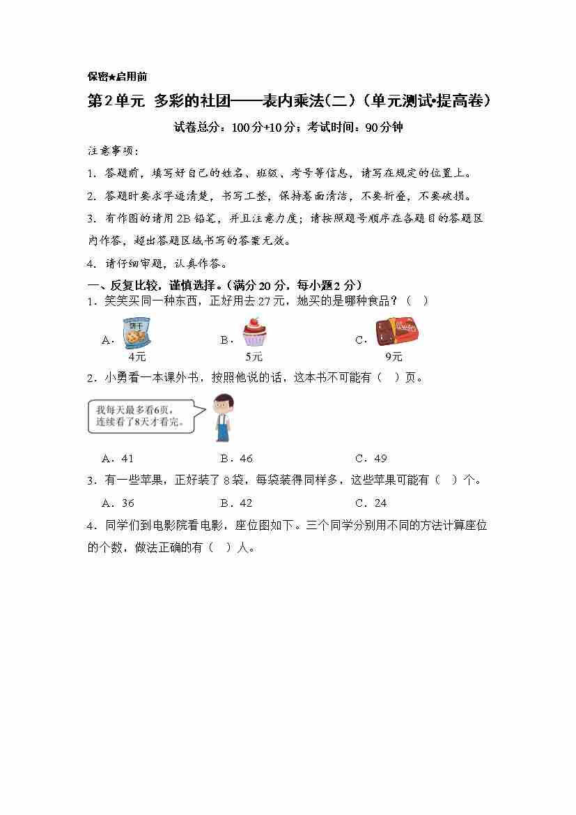 第2单元 多彩的社团——表内乘法(二)(单元测试•提高卷)数学青岛版(五四制)二年级上册(A4版)