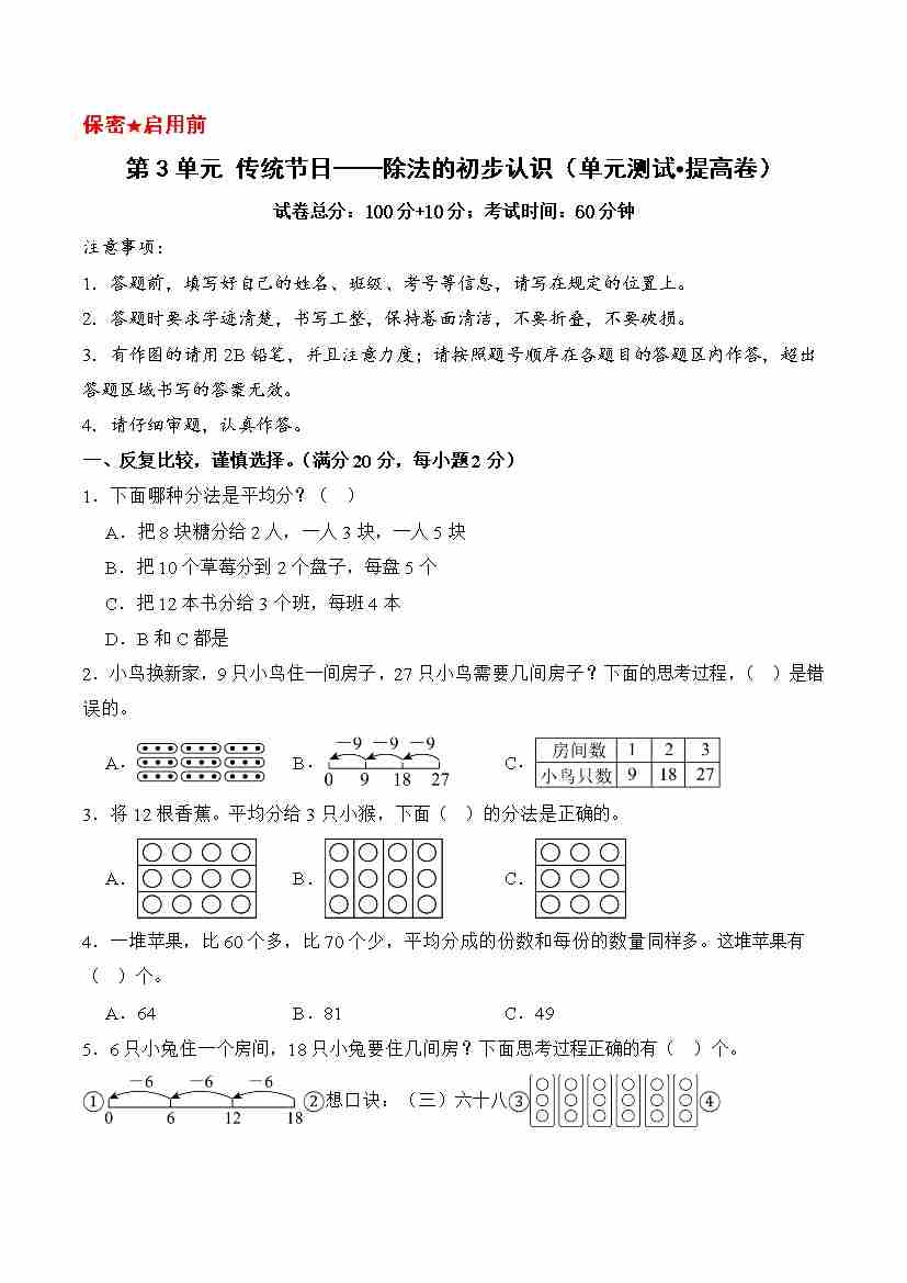 第3单元 传统节日——除法的初步认识(单元测试•提高卷)数学青岛版(五四制)二年级上册(A4版)