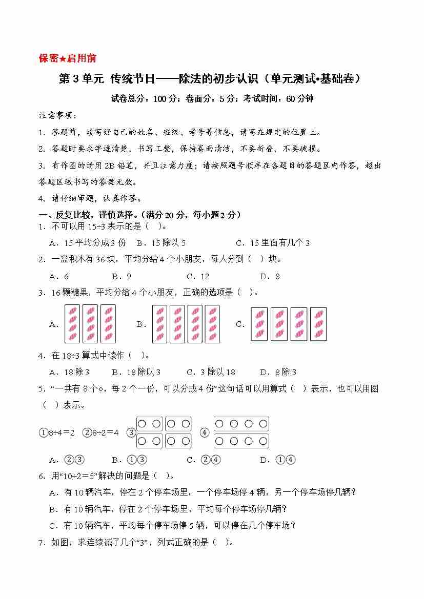 第3单元 传统节日——除法的初步认识(单元测试•基础卷)数学青岛版(五四制)二年级上册(A4版)