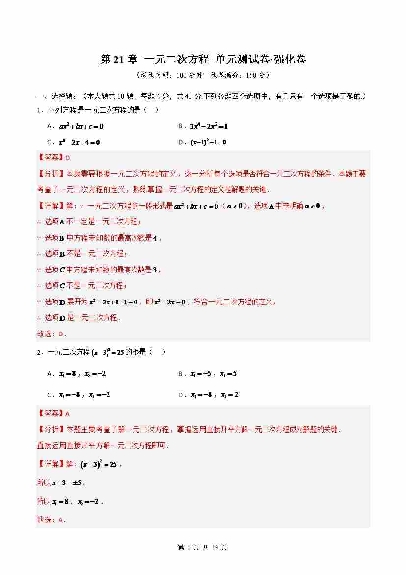 第21章 一元二次方程(高效培优单元测试·强化卷)(解析版)