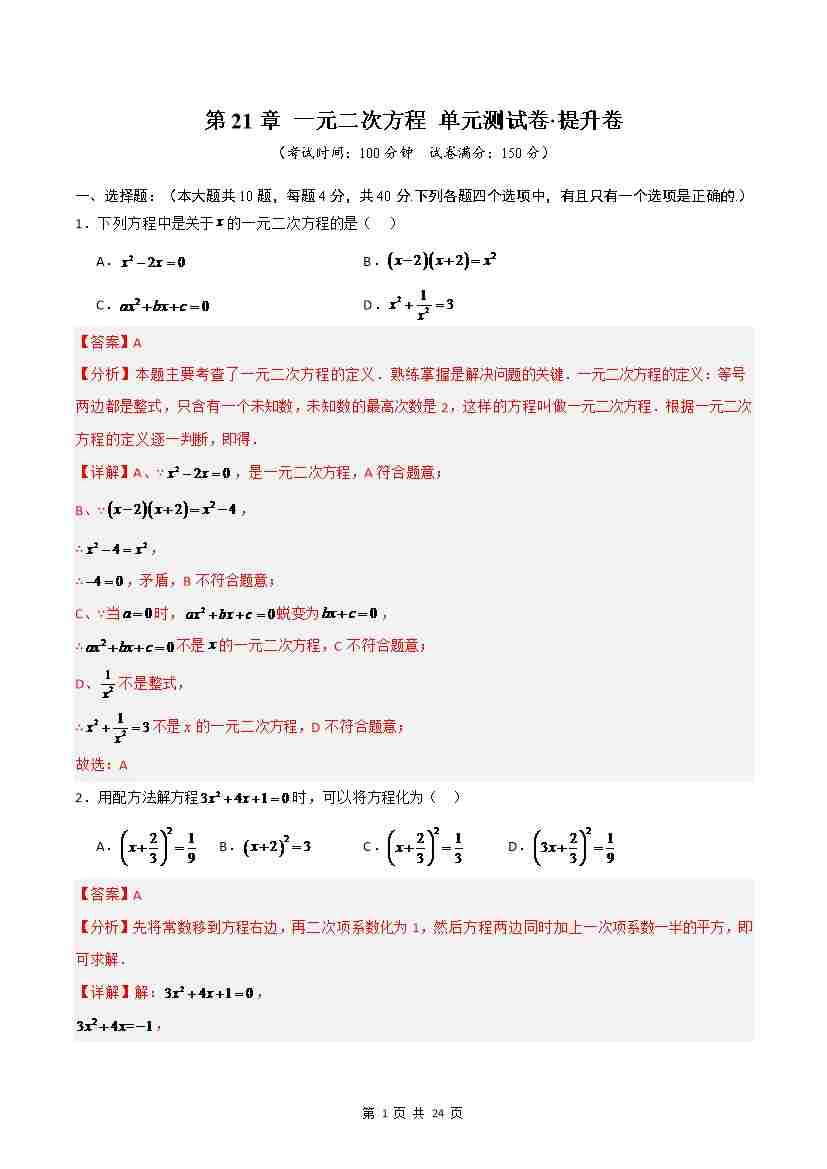 第21章 一元二次方程(高效培优单元测试·提升卷)(解析版)