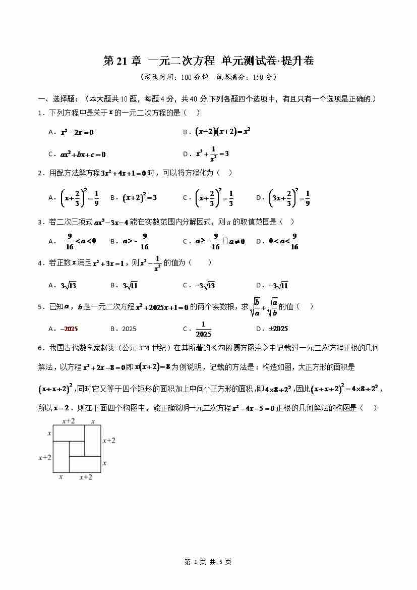 第21章 一元二次方程(高效培优单元测试·提升卷)(原卷版)