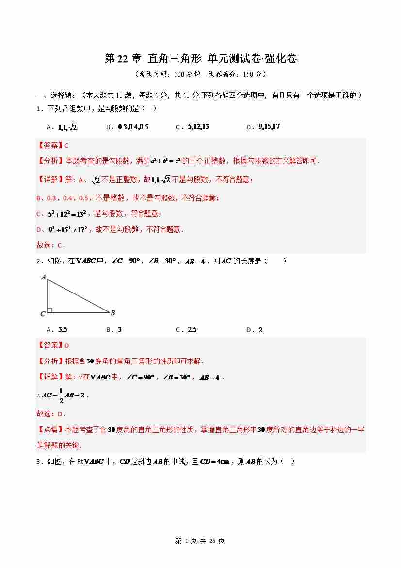 第22章 直角三角形(高效培优单元测试·强化卷)(解析版)