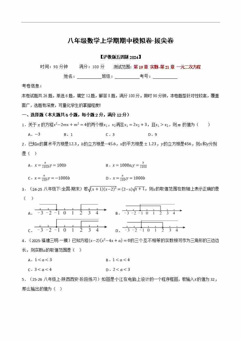 八年级数学上学期期中模拟卷·拔尖卷(沪教版五四制2024,举一反三)(原卷版)