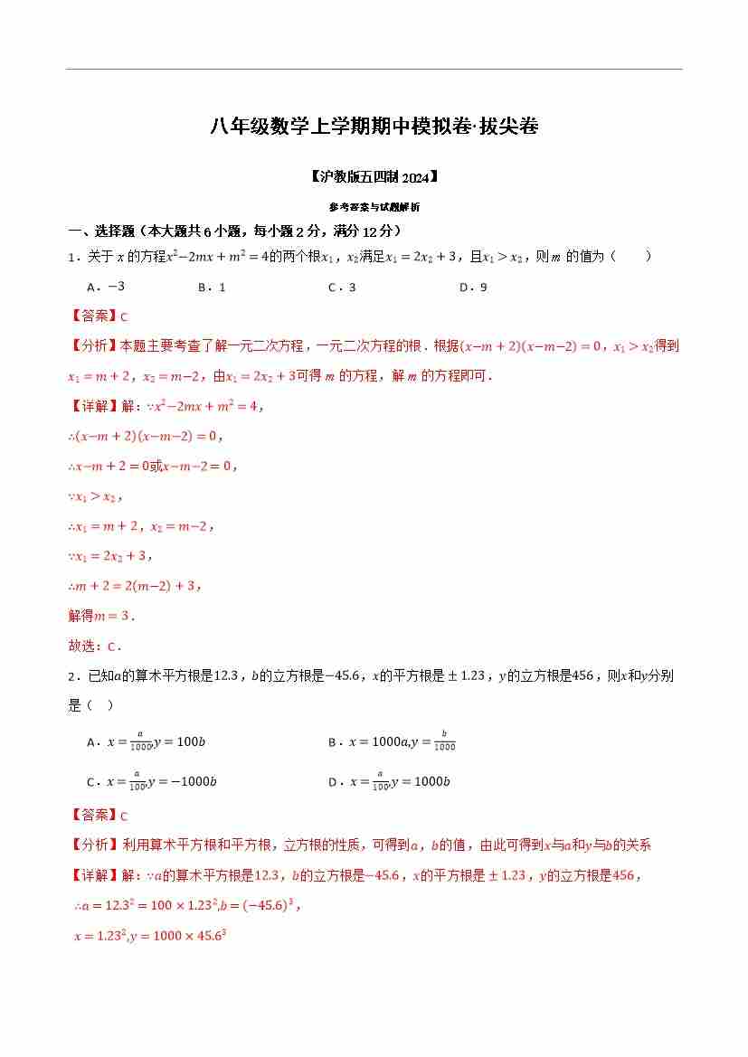 八年级数学上学期期中模拟卷·拔尖卷(沪教版五四制2024,举一反三)(解析版)