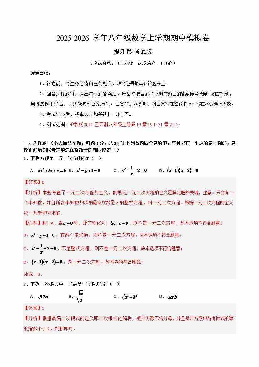 首页 > 全部 > 期中试卷 > 八年级数学上学期期中模拟卷(沪教版2024五四制第19章19.1~21章21.2,高效培优·提升卷)(全解全析)