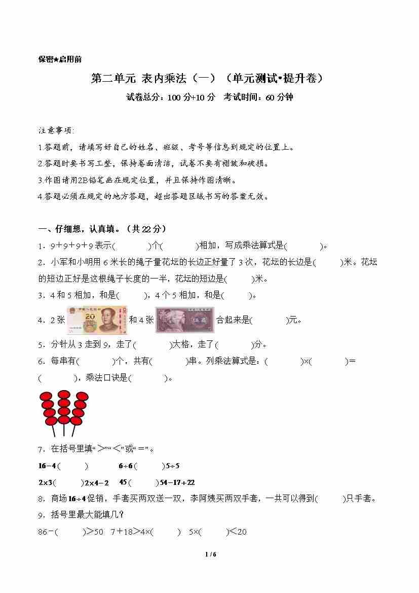 首页 > 全部 > 单元测试 > 第二单元 表内乘法(一)(单元测试•提升卷)数学青岛版二年级上册(A4版)