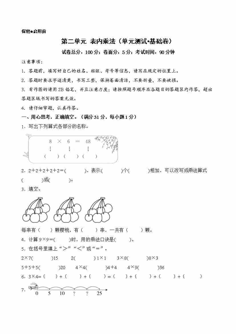 首页 > 全部 > 单元测试 > 第二单元 表内乘法(单元测试•基础卷)(A4)