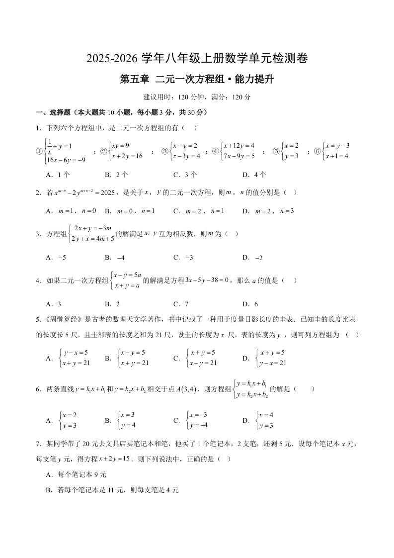 首页 > 全部 > 单元提升卷 > 八上数学第五章 二元一次方程组测试·提升卷(考试版A4)